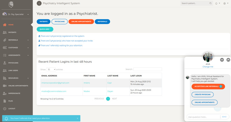 Created by a team of Psychiatrists and AI experts, Psychiatry Intelligent System is an AI Powered platform that features Smart Conversational Interfaces and Behavioural Pattern Recognition for mental health.